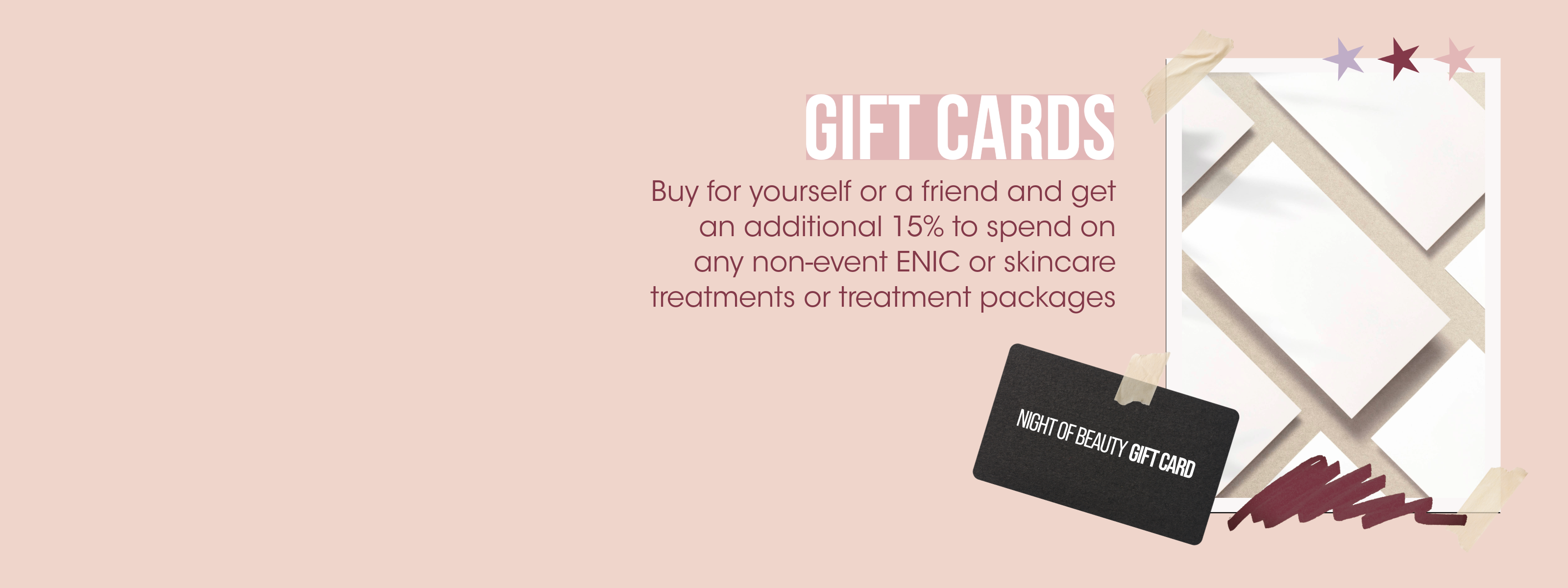 - Night of Beauty Gift Cards include an extra 15% value to use toward any ENIC or skincare services.